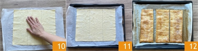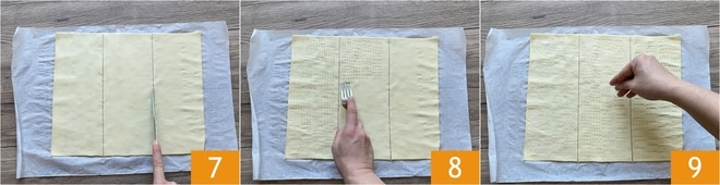 Schneiden Sie den Teig entlang der längeren Seite, um 3 gleich große Rechtecke zu erhalten 7. Stechen Sie den Teig mit den Zinken einer Gabel ein 8 und bestreuen Sie ihn großzügig mit Zucker 9.