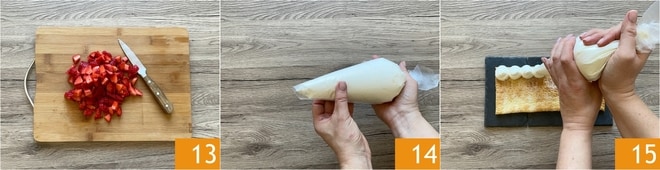 Waschen Sie inzwischen die Erdbeeren gut und legen Sie 4 ganze für die endgültige Dekoration beiseite. Entfernen Sie den Stiel von den anderen und schneiden Sie sie in Würfel 13. Sobald die Creme fest ist, geben Sie sie in einen Spritzbeutel. Sie können eine glatte Tülle verwenden oder einfach die Spitze des Spritzbeutels abschneiden 14. Nehmen Sie eine der Teigbasen und legen Sie sie auf eine Servierplatte. Machen Sie mit der Creme Tupfen über die gesamte Oberfläche 15.
