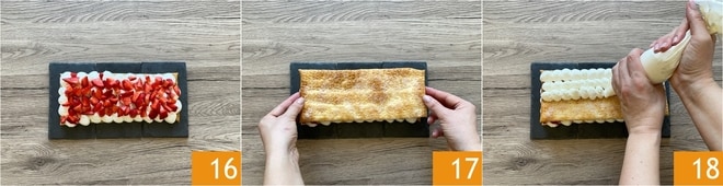 Fügen Sie die Hälfte der Erdbeeren hinzu 16 und bedecken Sie sie mit der zweiten Teigbasis 17. Machen Sie eine weitere Cremeschicht, indem Sie immer den Spritzbeutel verwenden 18.