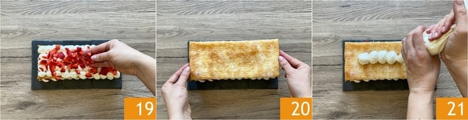 Fügen Sie die restlichen Erdbeeren hinzu 19 und schließen Sie mit der letzten Teigschicht ab 20. Machen Sie mit der restlichen Creme Tupfen in der Mitte des Teigs 21.
