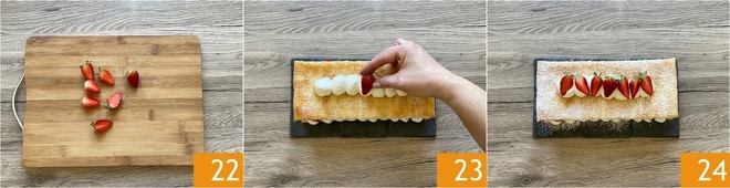 Nehmen Sie die beiseitegelegten Erdbeeren und halbieren Sie sie 22. Verwenden Sie sie, um das Millefeuille zu dekorieren, indem Sie sie auf die Cremetupfen legen 23. Bestreuen Sie das Erdbeermillefeuille mit Puderzucker 24 und stellen Sie es bis zum Verzehr in den Kühlschrank.