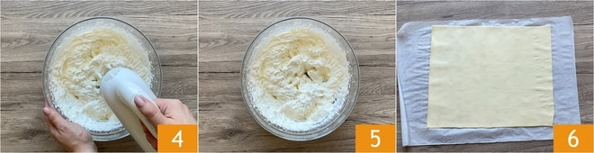 Schlagen Sie weiter 4, bis die Sahne fest und steif ist 5. Stellen Sie sie in den Kühlschrank und lassen Sie sie 2 Stunden lang fest werden. In der Zwischenzeit rollen Sie den Blätterteig auf einer Arbeitsfläche aus 6.