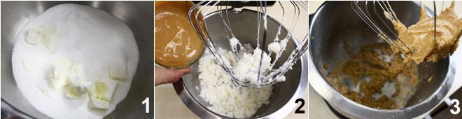 Um die Erdnussbutter-Muffins zuzubereiten, beginnen Sie damit, die in Stücke geschnittene, bei Raumtemperatur weich gewordene Butter und den Zucker 1 in eine Küchenmaschine (oder Schüssel) zu geben, starten Sie die Rührbesen, um die Mischung zu vermengen, fügen Sie die Erdnussbutter hinzu und schlagen Sie die Creme weiter 2, bis eine homogene Masse entsteht 3.