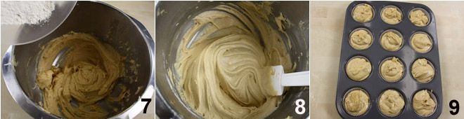 Zum Schluss fügen Sie der Masse nach und nach abwechselnd die Milch und das gesiebte Mehl zusammen mit dem Backpulver hinzu, indem Sie mit einem Spatel rühren 7. Wenn der Teig homogen ist 8, geben Sie ihn in die Papierförmchen, stellen Sie diese in ein Muffinblech 9 und backen Sie im vorgeheizten Umluftofen bei 180 Grad für 20 Minuten. Sobald die Muffins fertig sind, nehmen Sie sie aus dem Ofen und lassen Sie sie abkühlen.