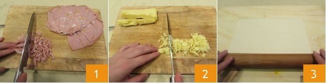 Um die Mortadella-Täschchen zuzubereiten, beginnen Sie mit der Zubereitung der Füllung. Hacken Sie sowohl die Mortadella 1 als auch den Käse 2 fein mit einem Messer. Nehmen Sie dann den Blätterteig und rollen Sie ihn leicht mit dem Nudelholz aus 3.