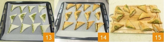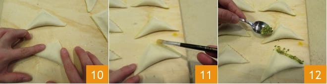 Schließen Sie sie nun zu einem Dreieck, indem Sie leicht mit den Fingern drücken 10. Bestreichen Sie auch die Ränder und die Mitte der Dreiecke mit dem Ei 11 und fügen Sie Pistaziengranulat hinzu, um Ihre Mortadella-Täschchen zu dekorieren 12.