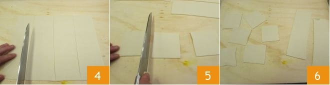 Daraus schneiden Sie zunächst 4 Streifen von ca. 8x25 cm 4 und schneiden dann aus diesen Streifen Rechtecke von ca. 8x9 cm (5-6).