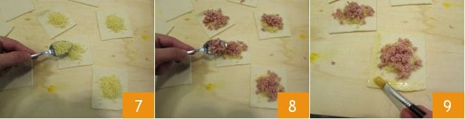 Geben Sie in die Mitte jedes Rechtecks 1 Teelöffel Käse 7 und 1 Teelöffel Mortadella 8, die zuvor gehackt wurden. Bestreichen Sie dann die Ränder des Rechtecks mit dem leicht verquirlten Eigelb 9.