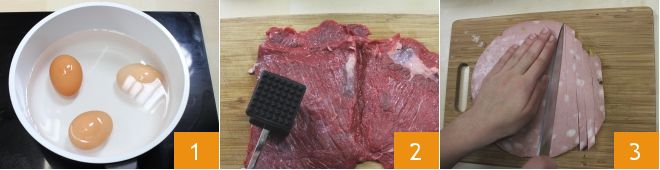 Um das Falsomagro zuzubereiten, beginnen Sie damit, die Eier in einem kleinen Topf mit Wasser hart zu kochen 1. Nehmen Sie dann die Rindfleischscheibe und klopfen Sie sie mit einem Fleischklopfer gut durch, um die Dicke gleichmäßig zu machen 2. Schneiden Sie die Mortadella 3,