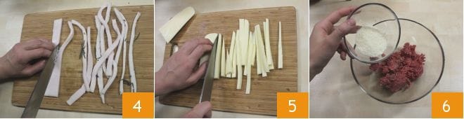 den Speck 4 und den Caciocavallo 5 in etwa 0,5 cm breite Streifen und legen Sie alles beiseite. In einer großen Schüssel das Hackfleisch und den geriebenen Käse vermischen 6