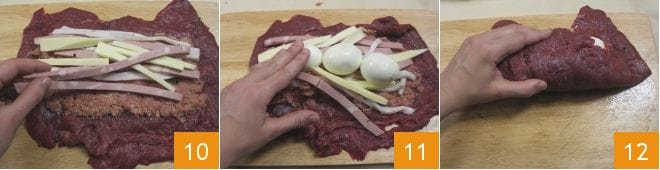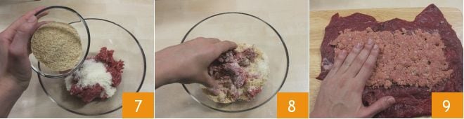 und das Paniermehl 7 hinzufügen, dann alles gut mit den Händen verkneten 8. Mit Salz und Pfeffer abschmecken, dann die Mischung auf die Rindfleischscheibe legen 9, darauf achten, dass sie gut verteilt wird und etwa 2 cm Rand auf jeder Seite frei bleibt, um zu verhindern, dass die Füllung beim Aufrollen des Fleisches austritt.