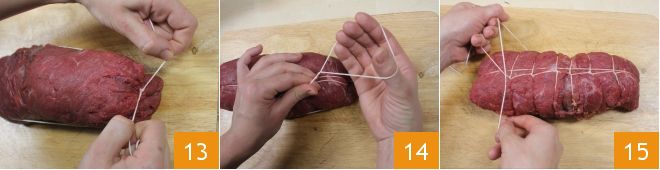 Schließen Sie das Falsomagro, indem Sie das Fleisch auf sich selbst rollen; zum Versiegeln verwenden Sie Küchengarn, wie in den Bildern gezeigt (13-14-15) (für eine ausführlichere Anleitung, wie man einen Braten bindet hier klicken).