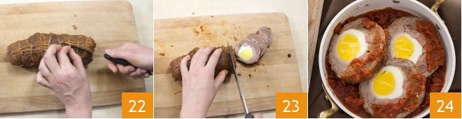 nach ein paar Minuten mit Rotwein ablöschen 19. Dann die Tomatenpassata 20 hinzufügen, einen Esslöffel dreifach konzentriertes Tomatenmark, Salz und Pfeffer. Mit einem Deckel abdecken 21 und das Falsomagro bei schwacher Hitze 60 Minuten lang kochen lassen, dabei gelegentlich wenden, um es gleichmäßig zu garen. Nach dieser Zeit prüfen, ob das Falsomagro fertig ist, indem man es mit einer Fleischgabel einsticht: Das Fleisch sollte zart sein.
