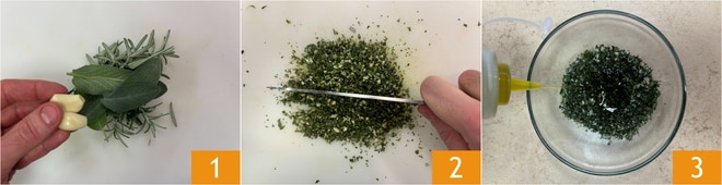 Um das Perlhuhn aus dem Ofen zuzubereiten, hacken Sie zuerst fein 2 geschälte Knoblauchzehen, einen Zweig Rosmarin und 3 Salbeiblätter 1 2. Geben Sie alles in eine Schüssel und würzen Sie es mit Öl 3.