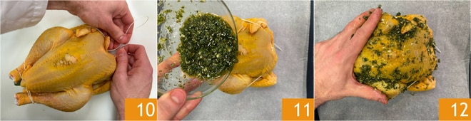 Führen Sie die Schnur um die Flügel herum und knoten Sie sie oben fest 10, so behält das Perlhuhn seine Form beim Garen. Legen Sie das Perlhuhn auf ein mit Backpapier belegtes Backblech, geben Sie die gehackten Kräuter auf das Perlhuhn 11 und massieren Sie das Fleisch 12, um die Kräuter auf der gesamten Oberfläche zu verteilen. Backen Sie im vorgeheizten Umluftofen bei 180°C für 20 Minuten.