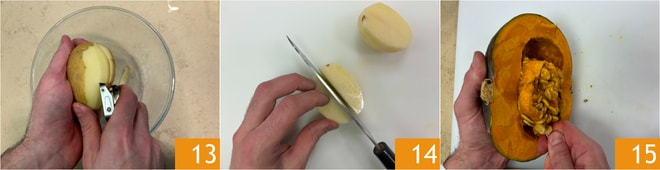 Inzwischen schälen Sie die Kartoffeln 13 und schneiden sie in Spalten 14. Entfernen Sie die Samen und die inneren Fasern des Kürbisses 15.