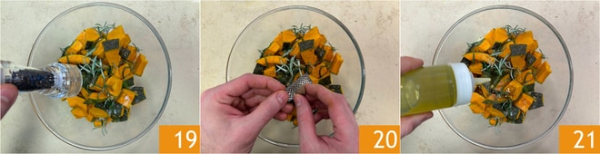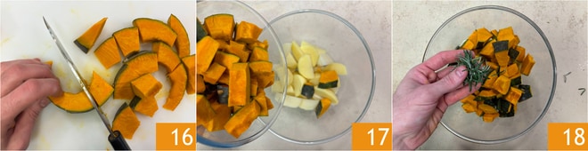 Schneiden Sie ihn dann in 3 cm große Würfel 16. Geben Sie Kartoffeln und Kürbis in eine Schüssel 17 und würzen Sie mit Rosmarin 18.