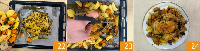 Fügen Sie das Gemüse zum Perlhuhn in die Backform hinzu 22, schneiden Sie die Schnur durch 23 und setzen Sie das Garen für weitere 40 Minuten auf die gleiche Weise fort. Nehmen Sie es aus dem Ofen, lassen Sie das Perlhuhn 10 Minuten ruhen und servieren Sie es dann. Ihr Perlhuhn aus dem Ofen ist bereit zum Servieren 24!