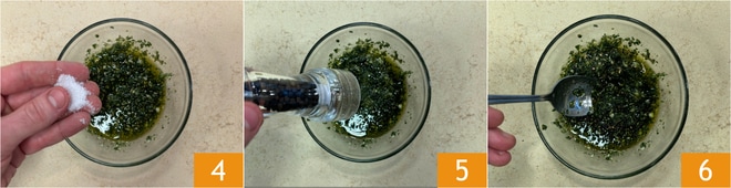 Würzen Sie mit Salz 4 und Pfeffer 5 und mischen Sie 6.