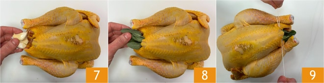 Füllen Sie das Perlhuhn mit zwei weiteren zerdrückten Knoblauchzehen 7, drei Salbeiblättern 8 und einem Zweig Rosmarin. Binden Sie die Schenkel des Perlhuhns mit Schnur zusammen 9.