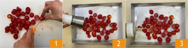 Um das Faschierte von Fassona zuzubereiten, waschen Sie die Kirschtomaten und schneiden Sie sie in Hälften 1. Legen Sie sie auf ein Backblech und würzen Sie sie mit einer Prise Salz 2, etwas Pfeffer und einem Schuss extra natives Olivenöl 3. Backen Sie sie 20 Minuten lang im Umluftofen bei 180°C.