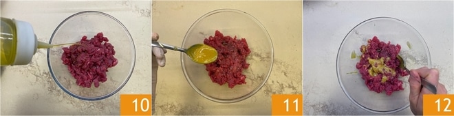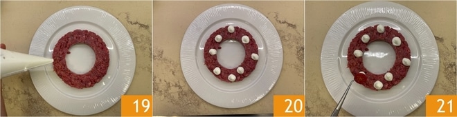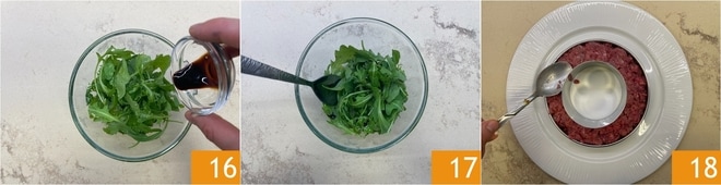Fügen Sie auch den Balsamico-Essig hinzu 16 und mischen Sie gut 17. Mit Hilfe von 2 runden Formen formen Sie einen Ring aus Faschiertem Fleisch in der Mitte des Tellers 18; Sie können 2 Ausstechformen verwenden, eine größere und eine etwas kleinere.
