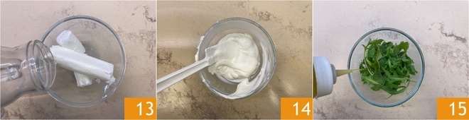 In einer kleinen Schüssel geben Sie den Ziegenkäse mit einem Spritzer Wasser 13, dann mischen Sie kräftig, bis Sie eine glatte Creme erhalten 14, die Sie bequem in einen Spritzbeutel füllen können. Würzen Sie den Rucola mit einer Prise Salz und einem Schuss Öl 15.