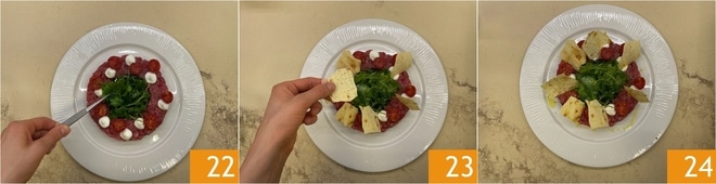 Platzieren Sie den Rucola in der Mitte 22 und vervollständigen Sie das Gericht mit Stücken von Pane Carasau, die ringsum platziert sind 23. Ihr Faschiertes von Fassona ist servierfertig 24!