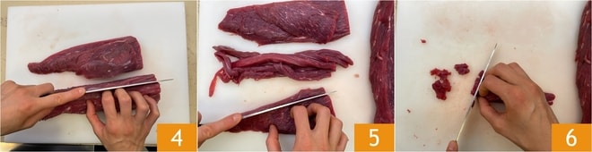 In der Zwischenzeit säubern Sie das Fassona-Roastbeef von den sehnigen Teilen, schneiden es zunächst in Scheiben 4 und dann in Streifen 5; zuletzt schneiden Sie es in Würfel 6.