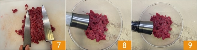 Mit 2 scharfen Messern hacken Sie das Fleisch weiter, bis es eine feine Körnung wie ein Tatar hat 7. Geben Sie es in eine Schüssel und würzen Sie es mit einer Prise Salz und frisch gemahlenem Pfeffer 9.