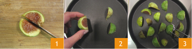 Um die Feigen-Crostini mit Grana Padano zuzubereiten, waschen Sie zuerst die Feigen und vierteln Sie sie 1. Erhitzen Sie einen Grill gut, legen Sie die Feigen darauf 2 und grillen Sie sie für etwa 2 Minuten 3, dann beiseitelegen.