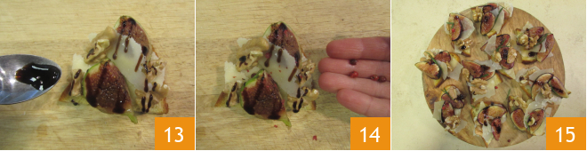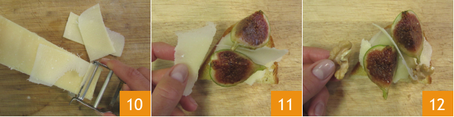 Zuletzt schneiden Sie mit einem Sparschäler dünne Scheiben Grana Padano DOP ab 10. Sie sind bereit, Ihre Crostini zu belegen: Legen Sie 2 Viertel Feigen auf jeden Crostini, fügen Sie ein paar Scheiben Grana Padano DOP hinzu 11 und ein paar Walnusskerne 12.