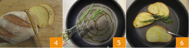 Schneiden Sie 5 Scheiben Brot ab 4. In einer Pfanne erhitzen Sie das Öl mit Rosmarin und einer Prise Salz 5 und rösten die Brotscheiben auf beiden Seiten für ungefähr 2 Minuten bis sie goldbraun sind 6.