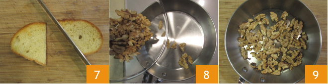 Teilen Sie die gerösteten Brotscheiben in zwei Hälften 7. Nun geben Sie die Walnusskerne in eine andere heiße Pfanne 8 und rösten sie für etwa 2 Minuten 9.