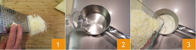 Um die Feigen mit Pecorino zuzubereiten, beginnen Sie mit Letzterem: reiben Sie ihn 1 und legen Sie ihn beiseite. In einen kleinen Topf geben Sie die Sahne 2, erhitzen Sie sie, dann geben Sie den geriebenen Pecorino hinzu 3 und verrühren Sie es.