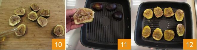 Würzen Sie auch mit einem Schuss Öl 10. Erhitzen Sie einen Grill auf dem Herd und wenn er sehr heiß ist, legen Sie Ihre Feigen hinein 11. Grillen Sie die Feigen für 1 Minute, drehen Sie sie dann um 12 und warten Sie eine weitere Minute.