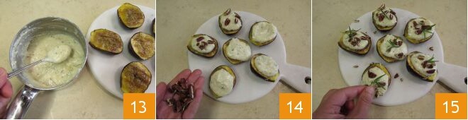 Übertragen Sie die Feigen auf einen Teller, geben Sie einen Löffel Fondue darüber 13 und garnieren Sie mit Pekannussstücken 14 und Rosmarinzweigen 15.