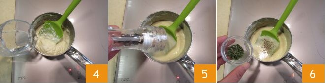 Geben Sie auch das Wasser hinzu 4 und rühren Sie weiter, warten Sie, bis der Käse vollständig geschmolzen ist. Würzen Sie mit frisch gemahlenem Pfeffer 5 und fein gehacktem Rosmarin 6. Schalten Sie die Herdplatte aus und stellen Sie das Fondue beiseite.