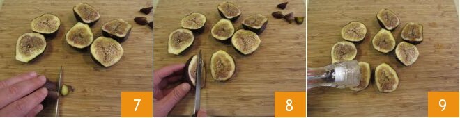 Nehmen Sie die Feigen, waschen Sie sie gut und trocknen Sie sie ab. Entfernen Sie den Stiel mit einem Messer 7 und schneiden Sie sie in der Hälfte 8. Würzen Sie mit Salz, frisch gemahlenem Pfeffer 9.