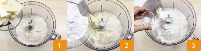 Um die Feigen- und Mascarpone-Tarte zuzubereiten, beginnen Sie mit dem Mürbeteig. Geben Sie das Mehl in eine Küchenmaschine und fügen Sie die kalte, in Stücke geschnittene Butter hinzu 1. Geben Sie auch den Puderzucker 2 und eine Prise Salz 3 hinzu, und schalten Sie die Küchenmaschine ein, bis Sie eine sandige Mischung erhalten.