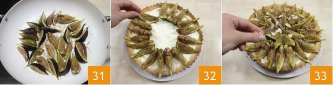 Kochen Sie, bis sie eine weiche und karamellisierte Konsistenz erreicht haben 31, drehen Sie sie sehr vorsichtig, um zu verhindern, dass sie zerfallen, und lassen Sie sie abkühlen. Zu diesem Zeitpunkt dekorieren Sie die Torte, indem Sie die Feigenspalten strahlenförmig anordnen 32 und mit einer Handvoll Mandelblättchen abschließen 33. Ihre Feigen- und Mascarpone-Tarte ist bereit, serviert und genossen zu werden!