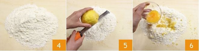 Geben Sie die Mischung auf eine Arbeitsfläche 4 und formen Sie in der Mitte eine Mulde. Dann reiben Sie die Zitronenschale 5 und fügen die Eigelbe hinzu 6.