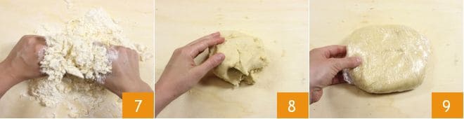Vermischen Sie alle Zutaten, indem Sie die Mischung von Hand bearbeiten 7, bis Sie einen ziemlich glatten und gleichmäßigen Teig erhalten 8. Formen Sie den Teig, wickeln Sie ihn in Frischhaltefolie ein 9 und lassen Sie ihn mindestens eine halbe Stunde im Kühlschrank ruhen. Um zu erfahren, wie man Mürbeteig am besten zubereitet und aufbewahrt, schauen Sie in unserer Kochschule nach: Mürbeteig.