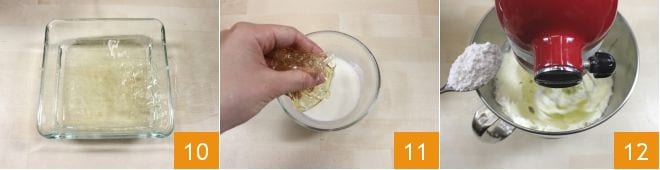 Bereiten Sie in der Zwischenzeit die Mascarpone-Creme vor: Legen Sie zuerst das Gelatineblatt für 10 Minuten in eine Schüssel mit kaltem Wasser 10. Nach dieser Zeit drücken Sie das Gelatineblatt aus und lösen es in 50 ml lauwarmer Sahne 11 auf. Geben Sie nun den Mascarpone in die Rührschüssel einer Küchenmaschine oder in eine Schüssel, um ihn mit einem elektrischen Mixer zu bearbeiten, und lockern Sie ihn mit dem Puderzucker 12 auf, wobei Sie 2 Esslöffel zurückhalten. Schlagen Sie nur für ein paar Sekunden mit den Rührbesen, sonst wird er zu klumpig.