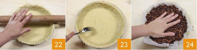 Entfernen Sie den überschüssigen Teig, indem Sie das Nudelholz an den Rändern der Backform entlangrollen 22 und stechen Sie den Boden des Mürbeteigs mit den Zinken einer Gabel ein 23. Danach führen Sie das Blindbacken durch: Legen Sie ein Backpapier auf den Boden und füllen Sie es mit trockenen Bohnen 24. Backen Sie die Form im vorgeheizten statischen Ofen bei 180°C für 30 Minuten, wenn Sie einen Umluftofen verwenden, backen Sie bei 160°C für 20 Minuten. Um zu erfahren, wie man das Blindbacken am besten durchführt, schauen Sie in unserer Kochschule nach: Wie man blind backt.