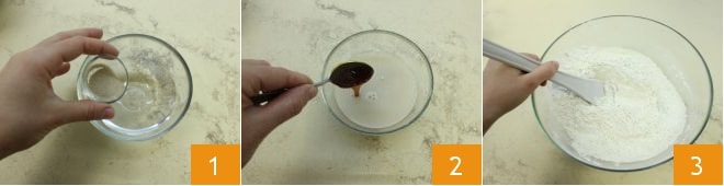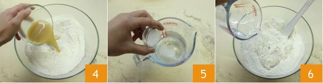 Dann fügen Sie die Mischung hinzu 4 und lösen das Salz im restlichen lauwarmen Wasser auf 5 und gießen es nach und nach hinzu, während Sie mit dem Löffel umrühren 6.