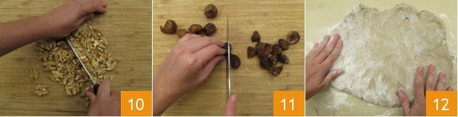 Wenn der Teig bereit ist, hacken Sie die Walnusskerne mit einem Messer 10 und zerkleinern Sie die getrockneten Feigen grob 11. Auf der leicht bemehlten Arbeitsfläche ziehen Sie den Teig mit der Hand zu einem großen Rechteck aus 12.