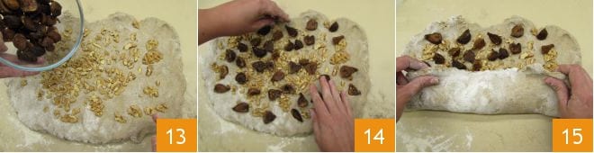 Bestreuen Sie die Trockenfrüchte 13 und verteilen Sie sie mit den Fingern am besten 14. Beginnen Sie, den Teig zu falten, indem Sie die Ränder hochheben und zur Mitte bringen 15.