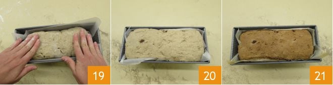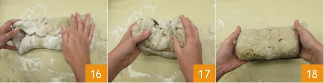 Damit sich die Früchte mit dem Teig verbinden, falten Sie weiter 16, so oft wie nötig 17. Formen Sie dann eine Rolle, die so groß ist wie die 26x10 cm große Kastenform, die mit Backpapier ausgelegt ist 18.