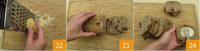 Reiben Sie den Bettelmatt mit einer groben Reibe 22. Schneiden Sie mit einem gezackten Messer 8 dicke Brotscheiben (ca. 1 cm) 23 und buttern Sie alle Scheiben auf einer Seite 24.